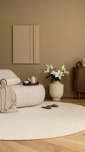 Разные фактуры делают нейтральный интерьер более выразительным. Льняной диван, шерстяной плед, хлопковые подушки и ковёр из натурального волокна создают ощущение глубины и уюта. Каждая ткань добавляет комнате мягкость и элегантность.