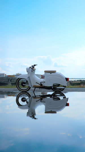 Белый цвет делает скутер визуально лёгким и дружелюбным, словно приглашая отправиться в небольшое путешествие. Круглые фары, компактные зеркала и классическая форма руля добавляют винтажного настроения и напоминают сцены из старых фильмов.