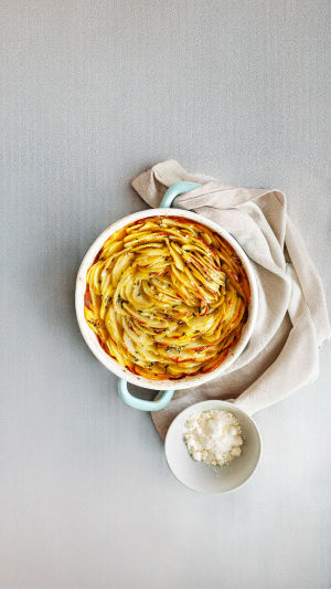 Разогрейте духовку и смажьте форму топлёным маслом. Начните выкладывать картофель по спирали, от центра к краям. Каждый слой смазывайте маслом и слегка приправляйте. Повторите несколько раз, пока форма не заполнится.
