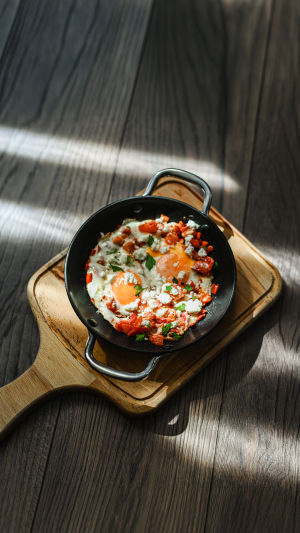 Этот рецепт в североафриканском стиле легко адаптировать под то, что есть под рукой: зелень, специи или немного остроты. В каждом кусочке сочетаются кислинка томатов, аромат специй и нежная текстура желтка — сытно, красиво и очень аппетитно.