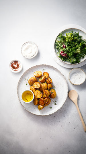 Мало какое блюдо способно соперничать с уютным ароматом и текстурой правильно запечённого картофеля. В этом рецепте маленький жёлтый картофель превращается в золотистые, мягкие внутри и хрустящие снаружи кусочки с ярким вкусом чеснока и свежего укропа.