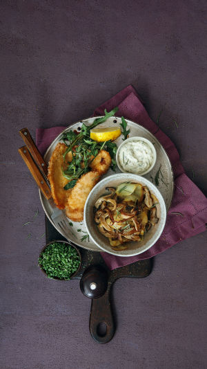 кухонный молоток или скалка, 3 неглубокие миски, сковорода или аэрогриль.